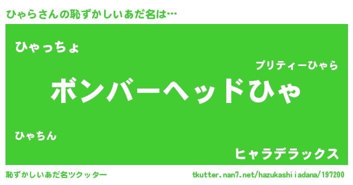 | 男性向けラノベタイトル風あだ名 | 『魔弾の王とひゃら』『ひゃらの憂鬱』 |