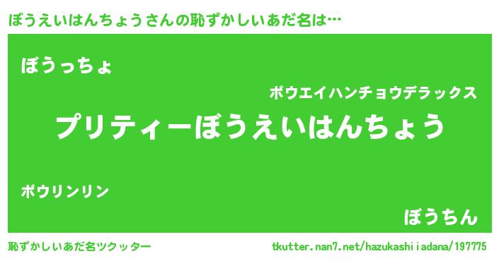 | 男性向けラノベタイトル風あだ名 | 『ボウエイハンチョウアートオンライン』 |