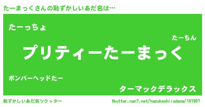 たーまっくさんの恥ずかしいあだ名は… 『プリティーたーまっく』『たーっちょ』『ターマックデラックス』 ツクッター #恥ずかしいあだ名ツクッター http://tkutter.nan7.net/hazukashiiadana/197807/
