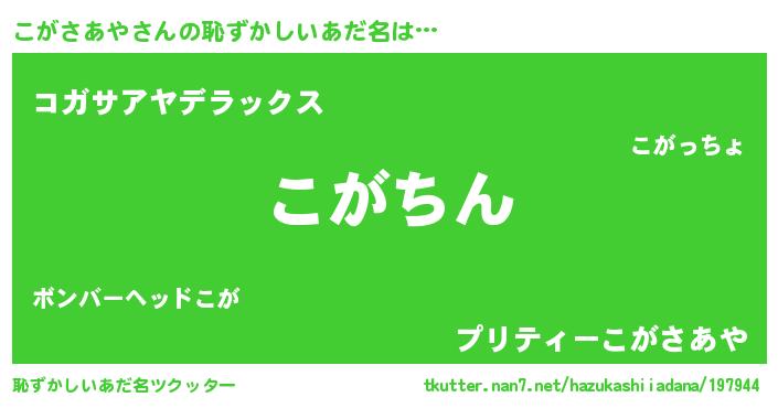 | ヘコむあだ名 | 『こがさあや(震え声)』『こがにゅー』 |