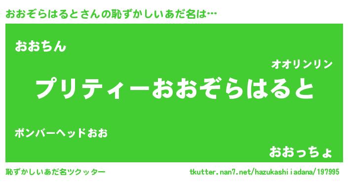 | 男性向けラノベタイトル風あだ名 | 『うちのおおぞらはるとが世界を掌握している!』 |