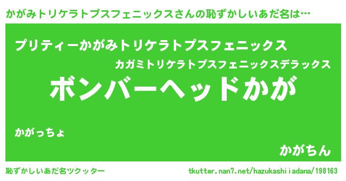 | 女子向けラノベタイトル風あだ名 | 『かがみトリケラトプスフェニックス恋絵巻』 |