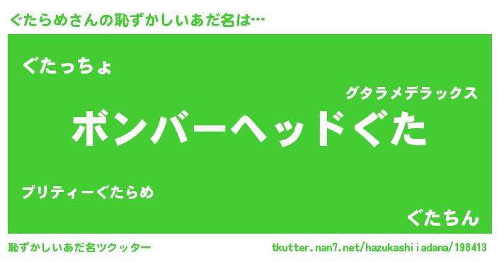 | ヒーロー風カッコイイあだ名 | 『慈愛の使者ぐたらめ』『ネオグタラメ』 |