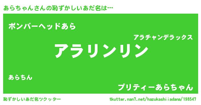 | ヒーロー風カッコイイあだ名 | 『幻影騎士アラ』『正義の使者あらちゃん』 |