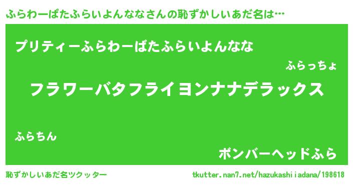 | 女子向けラノベタイトル風あだ名 | 『ふらわーばたふらいよんなななんてお断りですっ。』 |