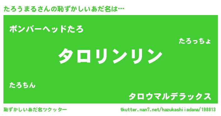 たろうまるさんの恥ずかしいあだ名は… 『タロリンリン』『ボンバーヘッドたろ』『タロウマルデラックス』 ツクッター #恥ずかしいあだ名ツクッター http://tkutter.nan7.net/hazukashiiadana/198813/