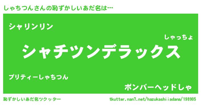| 男性向けラノベタイトル風あだ名 | 『Re:しゃちつんから始める異世界生活』 |