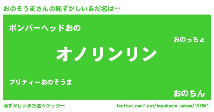 | 男性向けラノベタイトル風あだ名 | 『おのそうまの嫁は女の子じゃないと思った?』 |