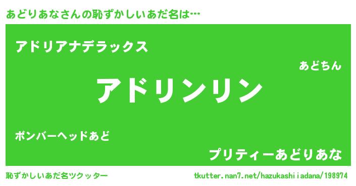 | 男性向けラノベタイトル風あだ名 | 『あどりあなの嫁は女の子じゃないと思った?』 |