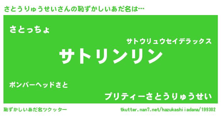 | 胡散臭い通販商品みたいなあだ名 | 『信頼と実績のサプリメント…その名も「さとうりゅうせい」』 |
