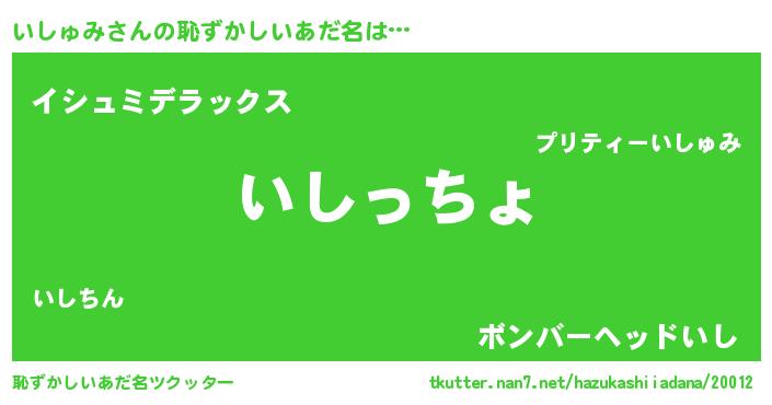 | 男性向けラノベタイトル風あだ名 | 『いしゅみ~年齢イコール彼女いない歴の魔法使い~』 |