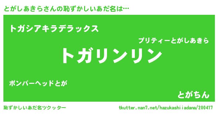 | ヘコむあだ名 | 『とが太郎』『とがしあきら(苦笑)』 |
