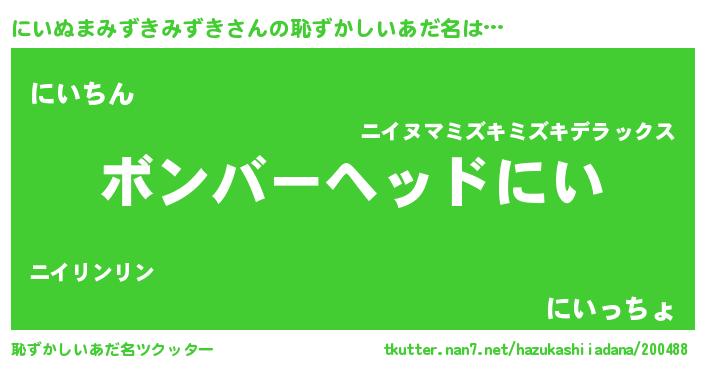 | 男性向けラノベタイトル風あだ名 | 『おまえをオタクにしてやるから、俺をにいぬまみずきみずきにしてくれ! 』 |