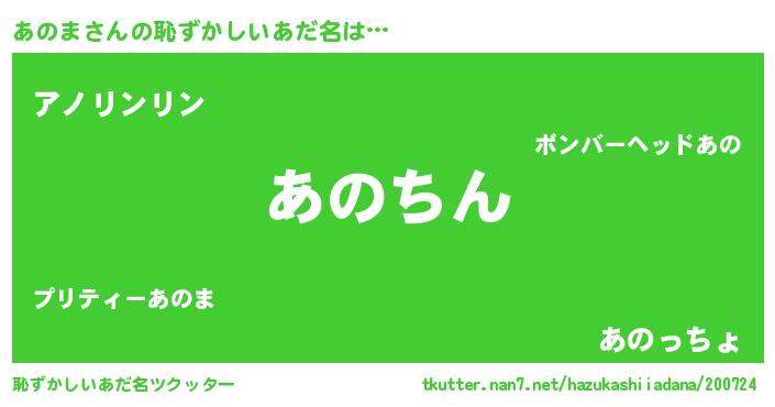 | 男性向けラノベタイトル風あだ名 | 『この素晴らしい世界にあのまを!』 |