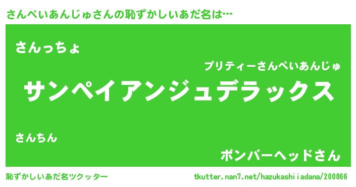 | 男性向けラノベタイトル風あだ名 | 『Re:さんぺいあんじゅから始める異世界生活』 |