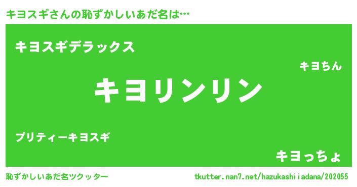 | 男性向けラノベタイトル風あだ名 | 『ダンジョンにキヨスギを求めるのは間違っているだろうか』 |