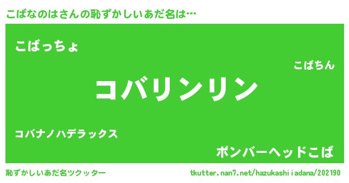 | ヒーロー風カッコイイあだ名 | 『暗黒騎士コバ』『慈愛の使者こばなのは』 |