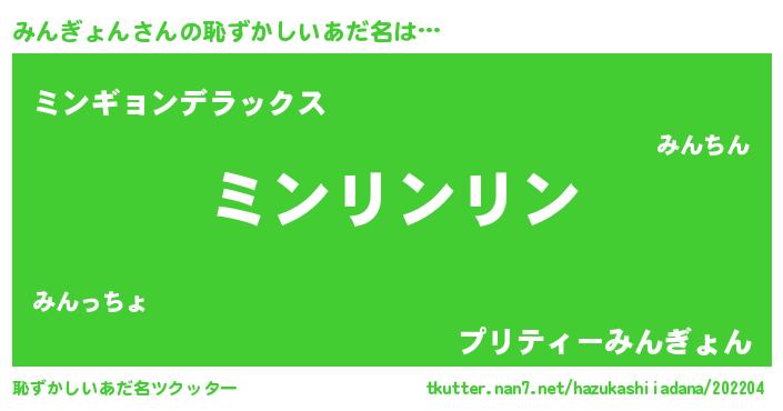 | 男性向けラノベタイトル風あだ名 | 『みんぎょんの嫁は女の子じゃないと思った?』 |