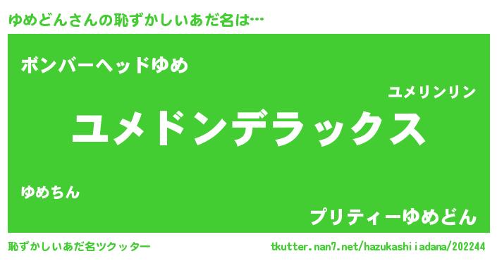 | 男性向けラノベタイトル風あだ名 | 『Re:ゆめどんから始める異世界生活』 |