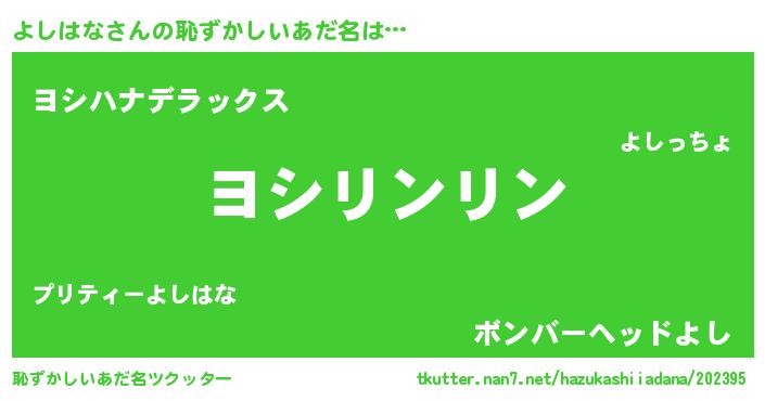 | 男性向けラノベタイトル風あだ名 | 『よしはなに滅ぼされるだけの簡単なお仕事です』 |