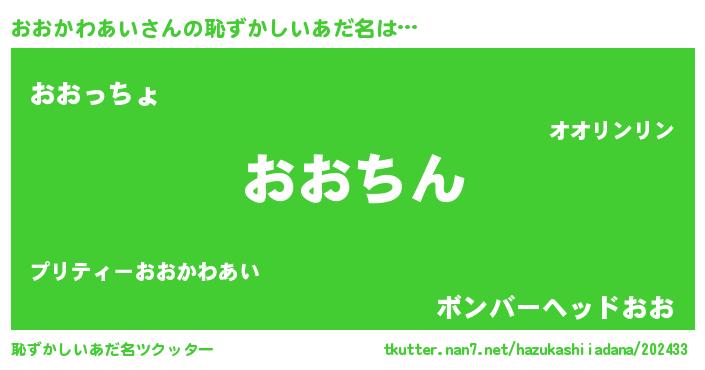 | ヘコむあだ名 | 『おおかわあい(苦笑)』『なまこ酢』 |