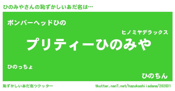 | ヘコむあだ名 | 『ひのにゅー』『ひのみや(笑)』 |