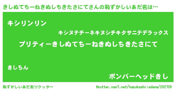 | 男性向けラノベタイトル風あだ名 | 『キシヌテチーネキヌシチキタサニテアートオンライン』 |