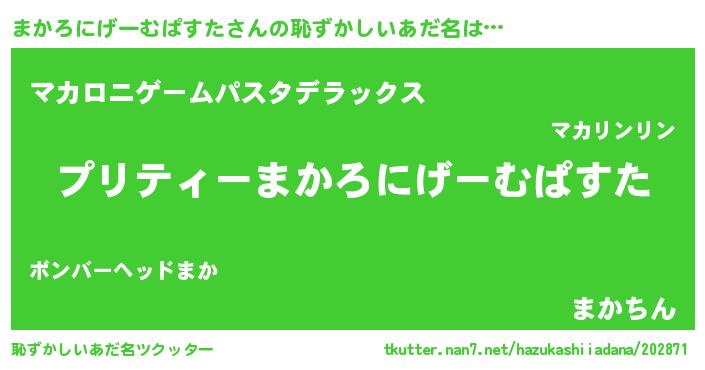 | 男性向けラノベタイトル風あだ名 | 『まかろにげーむぱすたの憂鬱』 |