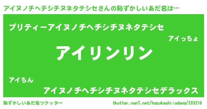 | 欧米人風あだ名 | 『ウサインアイヌノチヘチシチヌネタテシセ』 |