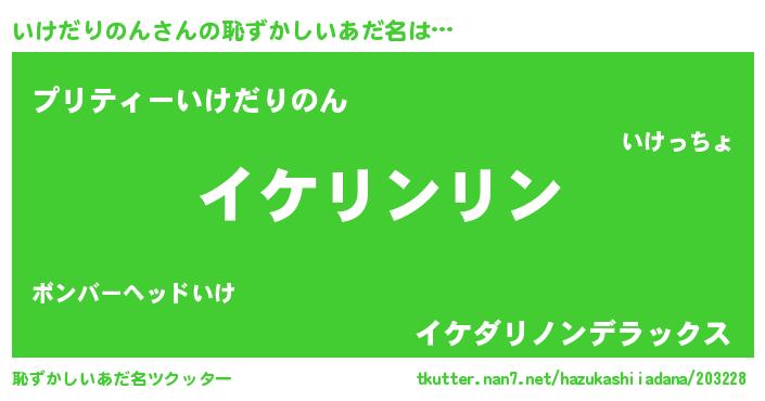 | 男性向けラノベタイトル風あだ名 | 『いけだりのん~年齢イコール彼女いない歴の魔法使い~』 |
