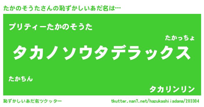 | 男性向けラノベタイトル風あだ名 | 『この素晴らしい世界にたかのそうたを!』 |