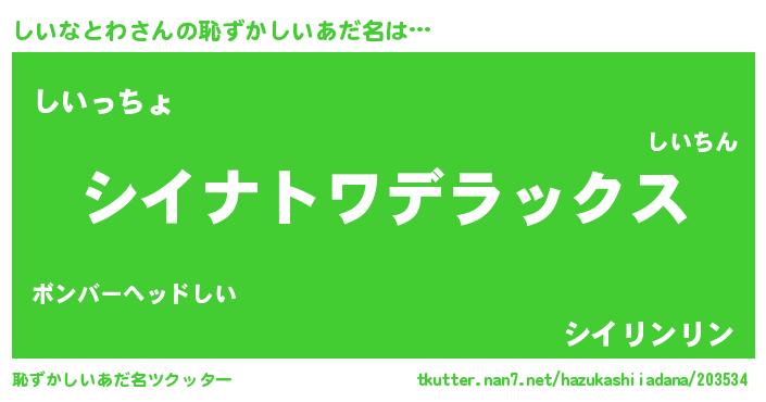 | 男性向けラノベタイトル風あだ名 | 『Re:しいなとわから始める異世界生活』 |