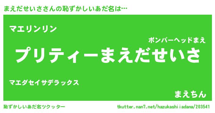 | 男性向けラノベタイトル風あだ名 | 『まえだせいさ~年齢イコール彼女いない歴の魔法使い~』 |