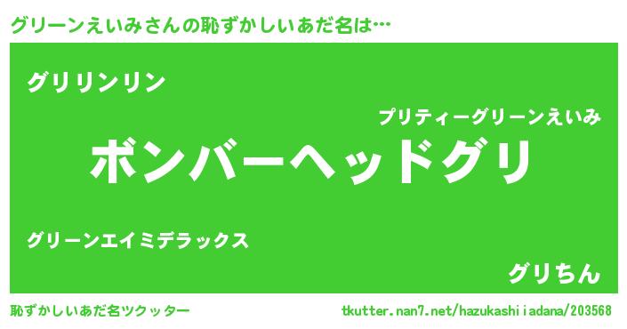 | 男性向けラノベタイトル風あだ名 | 『おまえをオタクにしてやるから、俺をグリーンえいみにしてくれ! 』 |