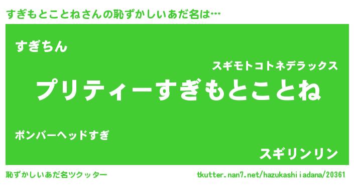 | 意味不明あだ名 | 『住所不定無職すぎもとことね(5歳)』 |