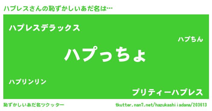 ハプレスさんの恥ずかしいあだ名は… 『ハプっちょ』『ハプレスデラックス』『プリティーハプレス』 ツクッター #恥ずかしいあだ名ツクッター http://tkutter.nan7.net/hazukashiiadana/203613/