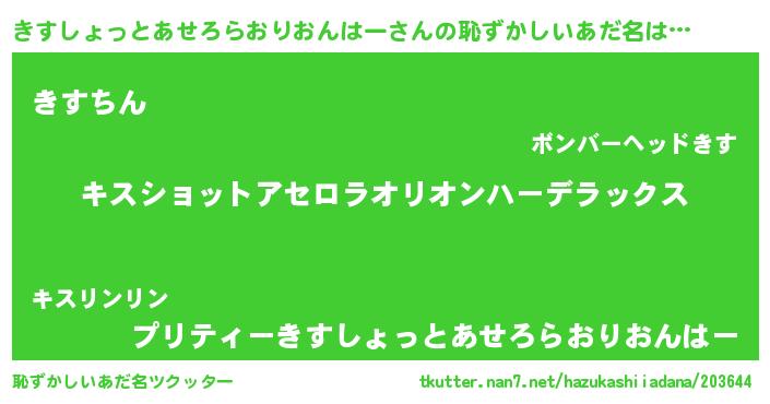 | 意味不明あだ名 | 『住所不定無職きすしょっとあせろらおりおんはー(86歳)』 |