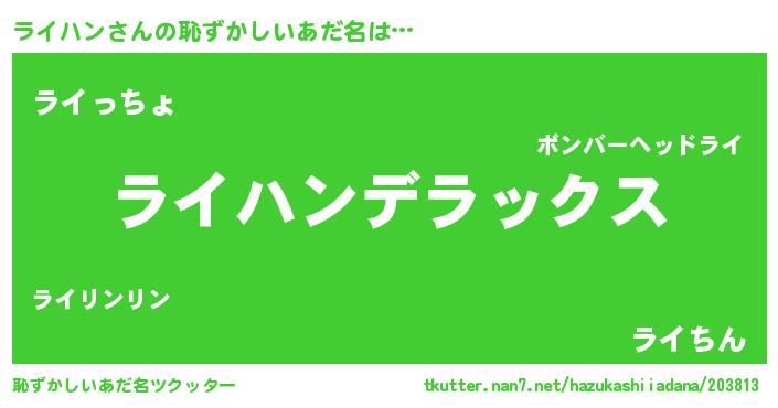 | ヘコむあだ名 | 『豆乳』『ライハン(笑)』『ライを』 |