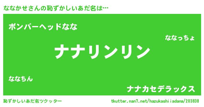 | 男性向けラノベタイトル風あだ名 | 『この素晴らしい世界にななかせを!』 |