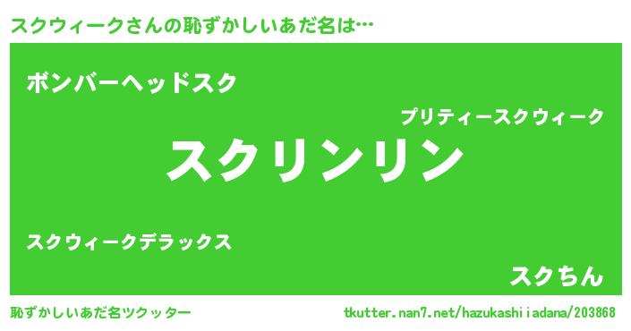 | 男性向けラノベタイトル風あだ名 | 『スクウィークの嫁は女の子じゃないと思った?』 |