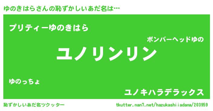 | 男性向けラノベタイトル風あだ名 | 『ゆのきはらの嫁は女の子じゃないと思った?』 |
