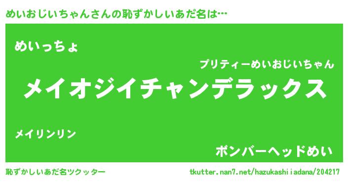 | 男性向けラノベタイトル風あだ名 | 『めいおじいちゃん~年齢イコール彼女いない歴の魔法使い~』 |