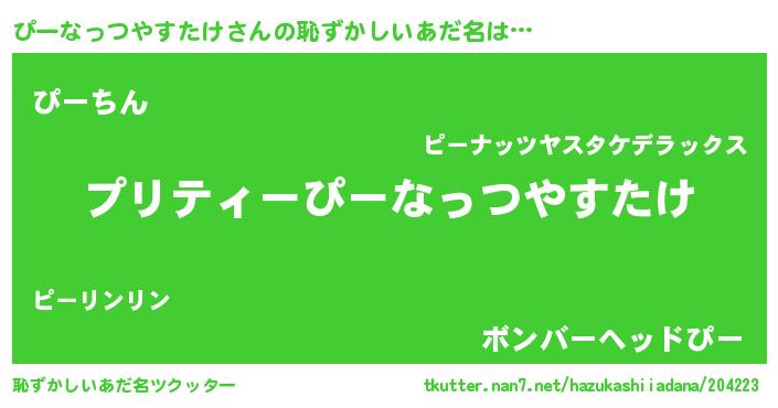 | 男性向けラノベタイトル風あだ名 | 『転生したらぴーなっつやすたけだった件』 |