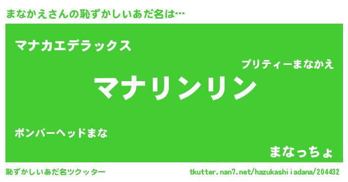 | 男性向けラノベタイトル風あだ名 | 『まなかえの嫁は女の子じゃないと思った?』 |