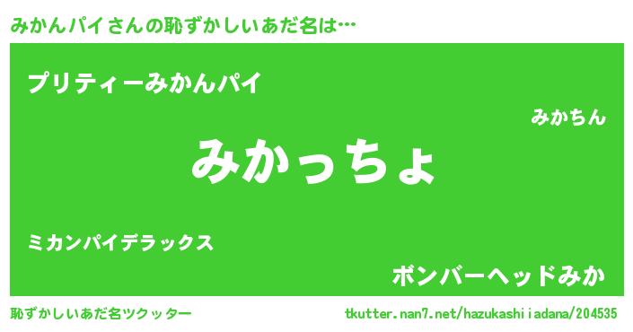 | 男性向けラノベタイトル風あだ名 | 『緋弾のミカンパイ』『みかんパイの憂鬱』 |