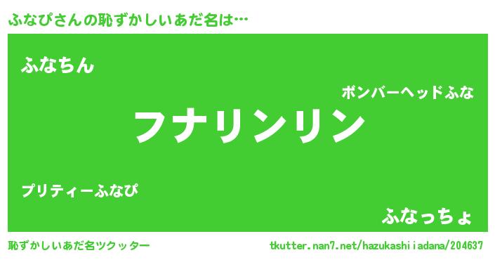 | 男性向けラノベタイトル風あだ名 | 『ふなぴの嫁は女の子じゃないと思った?』 |