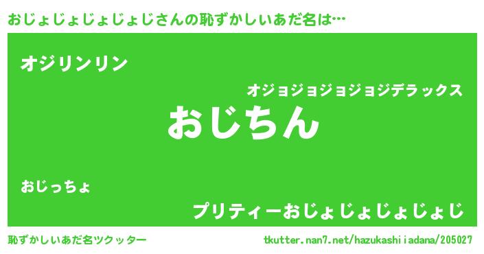 | 男性向けラノベタイトル風あだ名 | 『おじょじょじょじょじという概念が存在しない退屈な世界 』 |