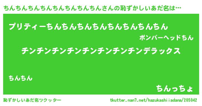 | 男性向けラノベタイトル風あだ名 | 『Re:ちんちんちんちんちんちんちんちんから始める異世界生活』 |