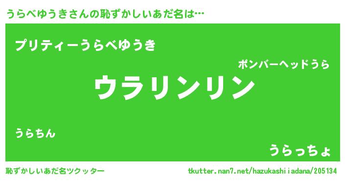 | 男性向けラノベタイトル風あだ名 | 『うらべゆうき~年齢イコール彼女いない歴の魔法使い~』 |
