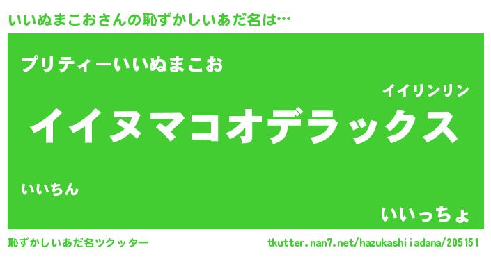 | 男性向けラノベタイトル風あだ名 | 『Re:いいぬまこおから始める異世界生活』 |